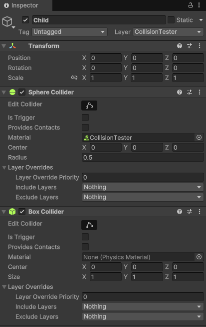 Collider를 추가한 게임오브젝트에 하나(스샷 기준 위 오브젝트)는 Is Trigger 옵션을 체크, 하나(아래)는 체크하지 않는다