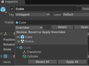 prefab의 인스펙터창에 생겨난 Prefab - Overrides의 Apply All을 누르면 복제한 모든 오브젝트가 바뀌게 된다.