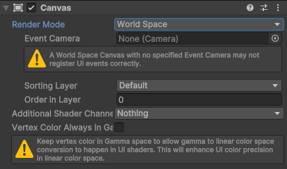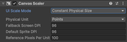 캔버스의 크기는 사각 트랜스폼을 사용하여 수동으로 설정할 수 있으며 UI 요소는 3D 배치에 기반하여 씬의 다른 오브젝트의 앞 또는 뒤에 렌더링 시킬 수 있다.