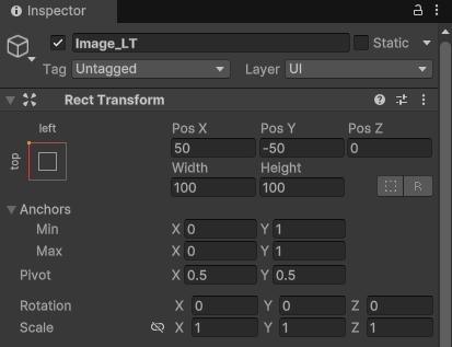 Anchors - 캔버스의 어느 부분을 기점으로 UI가 그려질 것인지 정하는 것 이다.