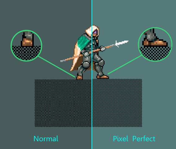 위 이미지는 Pixel Perfect를 적용한것과 아닌것의 차이를 보여주는데